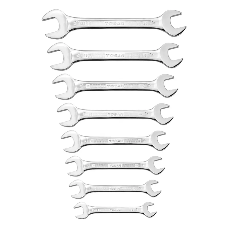• شامل 8 عدد آچار در سایز های : 6×7 ، 9×8 ، 11×10 ، 12×13 ، 14×15 ، 16×17 ، 18×19 ، 20×22 میلی متر